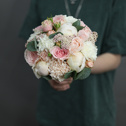 Свадебный букет диантусов, пионов, роз и озатамнуса