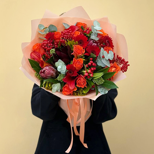Букет "Красный закат" из калл, роз, калины, скиммии, гиперикума, сафари, гербер и капса