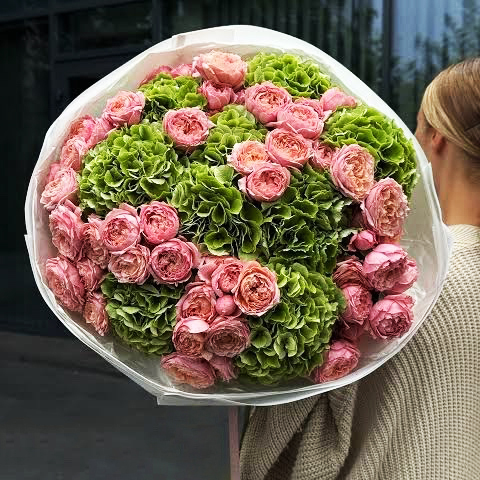 Букет "Фреш леди" из Голландских гортензий и пионовидных кустовых роз Джульетта