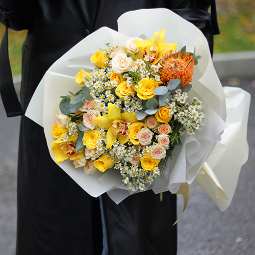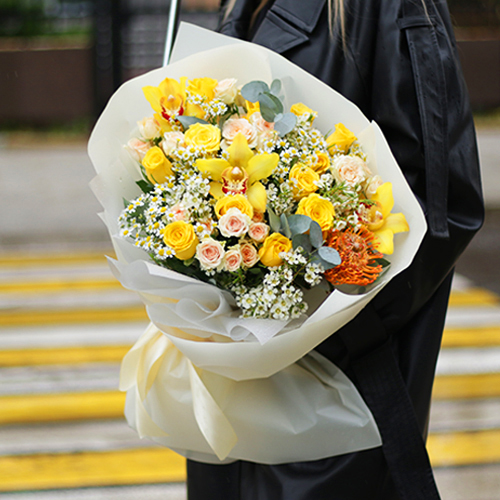 Букет "Пина колада" из роз, лейко, орхидей и ромашек