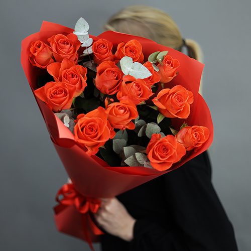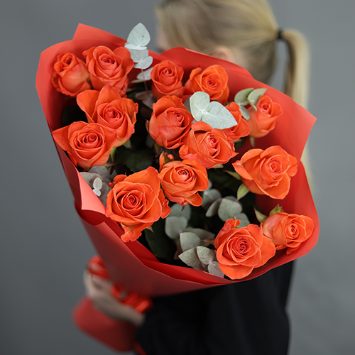 Букет из 15 морковных роз с эвкалиптом (70 см)